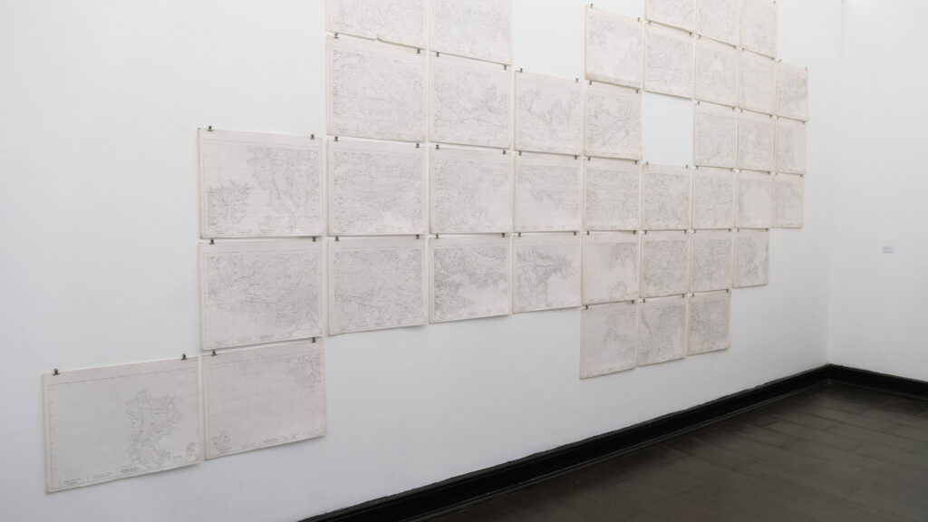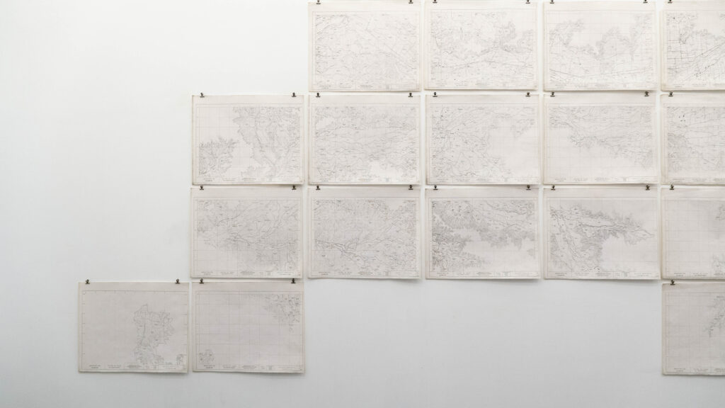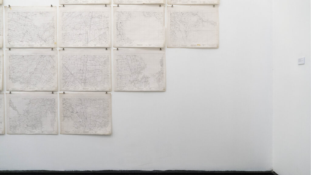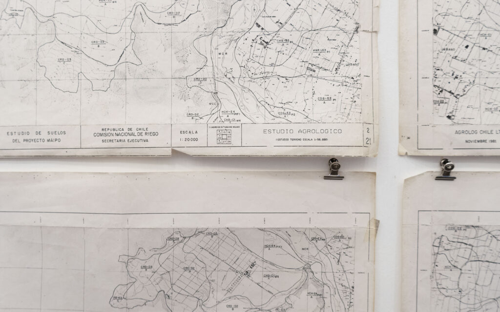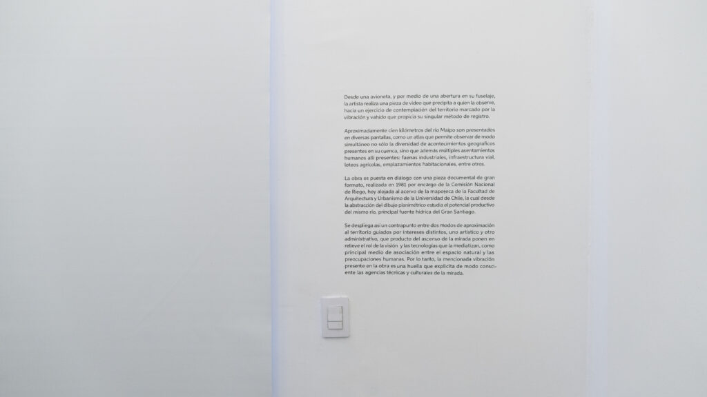 La obra es puesta en diálogo con una pieza documental de gran formato, realizada en 1981 por encargo de la Comisión Nacional de Riego, hoy alojada al acervo de la mapoteca de la Facultad de Arquitectura y Urbanismo de la Universidad de Chile, la cual desde la abstracción del dibujo planimétrico estudia el potencial productivo del mismo río, principal fuente hídrica del Gran Santiago. Se despliega así un contrapunto entre dos modos de aproximación al territorio guiados por intereses distintos, uno artístico y otro administrativo, que producto del ascenso de la mirada ponen en relieve el rol de la visión, y las tecnologías que la mediatizan, como principal medio de asociación entre el espacio natural y las preocupaciones humanas. Por lo tanto, la mencionada vibración presente en la obra es una huella que explicita de modo consciente las agencias técnicas y culturales de la mirada.