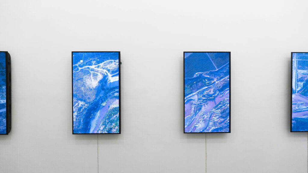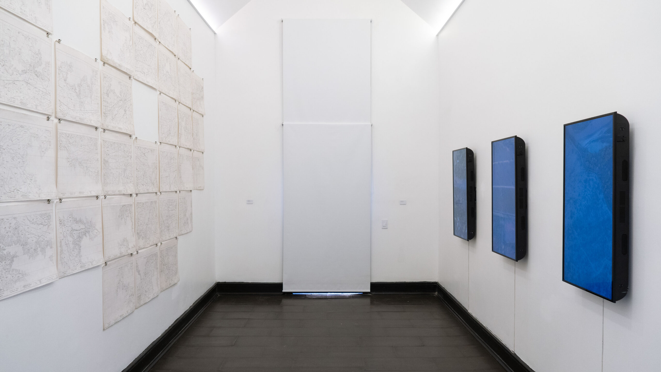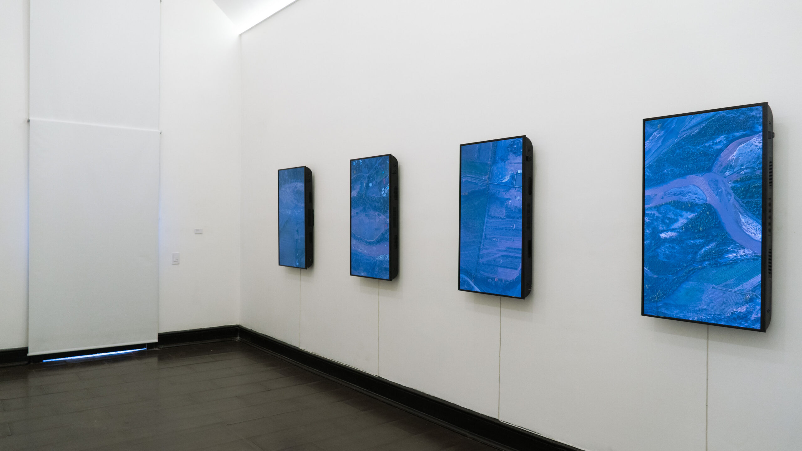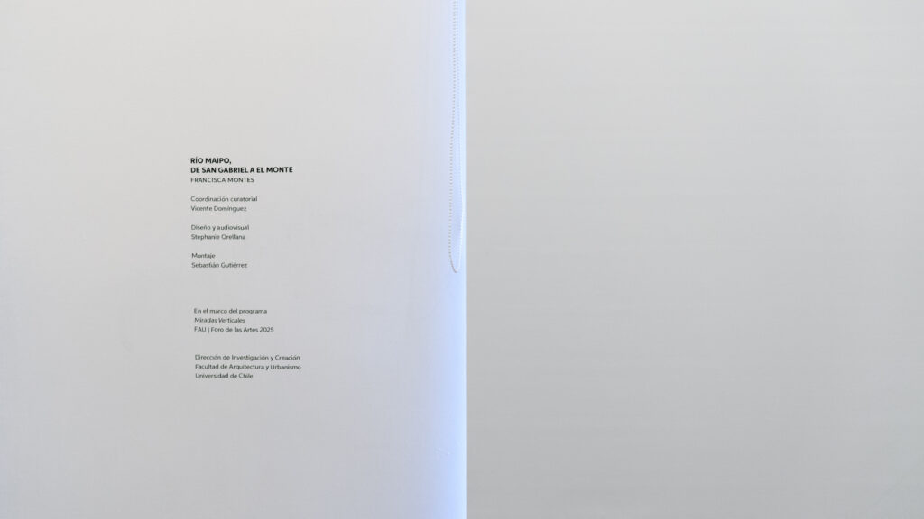 Aproximadamente cien kilómetros del río Maipo son presentados en diversas pantallas, como un atlas que permite observar de modo simultáneo no sólo la diversidad de acontecimientos geográficos presentes en su cuenca, sino que además múltiples asentamientos humanos allí presentes: faenas industriales, infraestructura vial, loteos agrícolas, emplazamientos habitacionales, entre otros.